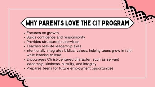 The Counselor in Training (CIT) Program is a leadership-focused summer experience for students ages 13–15 who are interested in growing as leaders and future counselors. Rooted in Biblical principles, the program intentionally blends hands-on camp experience, faith formation, and mentorship in a supportive, age-appropriate environment.